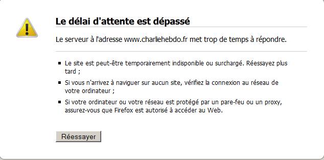 EDIT de 15h40 : C’était bien une attaque informatique mais personne n’en doutait. Par ailleurs, le site web de Charlie Hebdo est en attendant réfugié sous WordPress à l’adresse suivant : https://charliehebdo.wordpress.com/. Il n’y a pas de sites de secours /miroirs, il faut attendre que l’attaque cesse – un peu comme la grêle 🙂