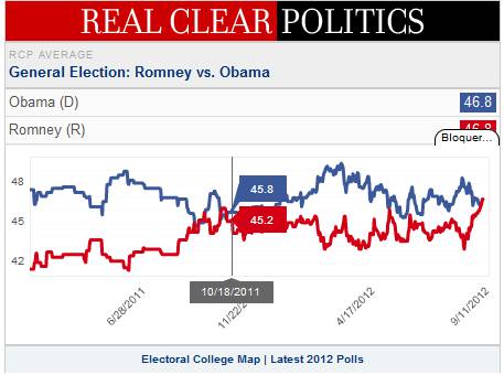 Selon le dernier sondage (05/09/2012), les deux candidats à la présidence des États-Unis sont à égalité à 46,8.