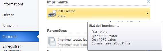 Une fois, PDFCREATOR installé, pour créer des PDF à partir d’un logiciel (dans notre exemple Word), il vous suffit d’imprimer vers une imprimante virtuelle, bien-nommée PDFCREATOR comme dans l’exemple ci-dessous :