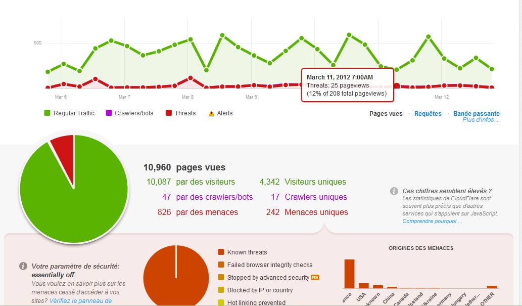 Cloudflare met à disposition des statistiques complètes à la fois sur vos visiteurs et vos menaces :