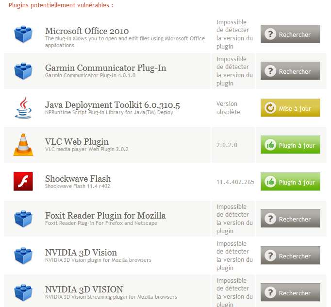 Vous arrivez alors sur une nouvelle page qui vous permet de vérifier l’état de chacun des plugins qui sont installés sur votre navigateur :
