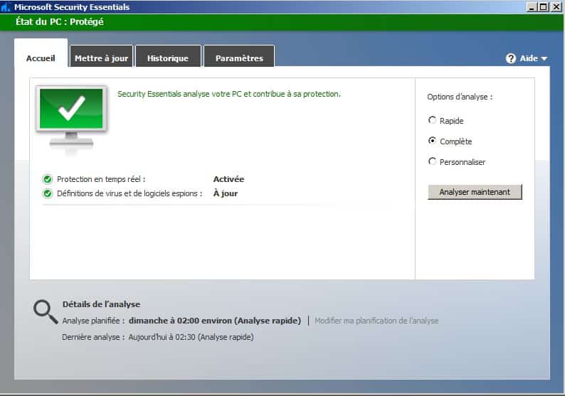 Microsoft Security Essentials protège vos ordinateurs contre les virus, les logiciels espions et autres programmes malveillants. Vos ordinateurs personnels ou ceux de votre petite entreprise bénéficient d’une protection en temps réel. Microsoft Security Essentials est un logiciel gratuit, facile à installer et convivial. Il fonctionne efficacement et silencieusement en arrière-plan pour vous laisser libre d’utiliser votre PC sans être interrompu ni sollicité lors des mises à jour.